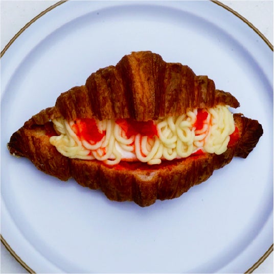 北海道を代表するジャガイモ「キタアカリ(別名:栗じゃが)」をメイン食材に使用。皮が薄くでんぷん質が少ない為、しっとり柔らかい食感が特徴で、粉っぽさもなく、甘みと旨みが際立ちます。これらの特性を活かし、モンブラン仕立てのポテトクリームを調製し、全粒粉仕込みのB²クロワッサンにサンドしました。アクセントにはなまら十勝野の赤パプリカを自家製ジャムに仕上げてトッピング。