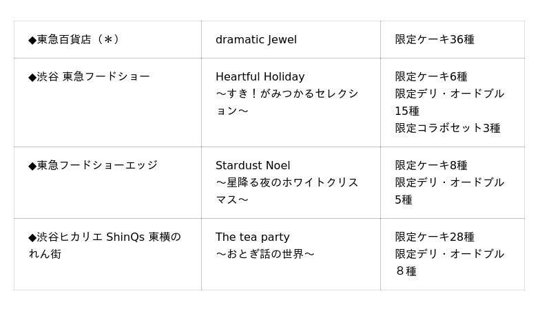 〇取り扱い数:ケーキ89種(東急百貨店(*)限定36種、ネットショッピング限定21種含む)