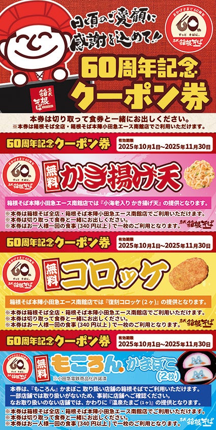 株式会社小田急レストランシステム(本社:東京都渋谷区 代表取締役社長:深海尚)が運営する「箱根そば」は、2025年9月25日(木)から60周年記念キャンペーン第7弾として、お食事をされたお客さまに「60周年記念クーポン券」を数量限定で無料配布いたします。今回のクーポン券には小田急電鉄株式会社の子育て応援マスコットキャラクター「もころん」のイラストを入れた「『もころん』かまぼこ(2ヶ)」が初めて登場しており、箱根そば自慢の「かき揚げ天」、カレー味が特徴の「コロッケ」との3枚綴りになっています。箱根そば全店・箱根そば本陣小田急エース南館店をご利用いただいたお客さまにお渡しします。