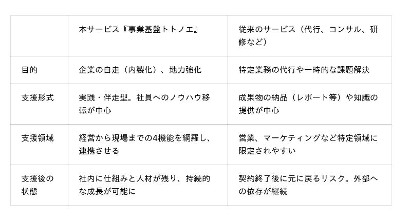 人手不足が深刻化する中、多くの中小企業が営業やマーケティングなどの業務を外部の代行事業者に委託しています。しかし、代行は一時的な成果には繋がるものの、ノウハウが社内に蓄積されず、かえって外部への依存を強めてしまう問題がありました。企業の持続的な成長のためには、外部の力に頼り続けるのではなく、自社で事業を推進できる「地力」の強化が不可欠です。 当社は、こうした課題を解決するため、企業の社員に寄り添い、共に汗を流しながら実践形式でノウハウを伝え、組織の「内製化」を支援する本サービスを開発いたしました。新サービス『事業基盤トトノエ』について