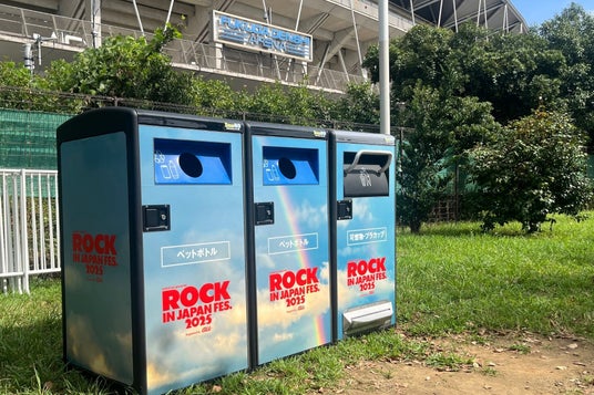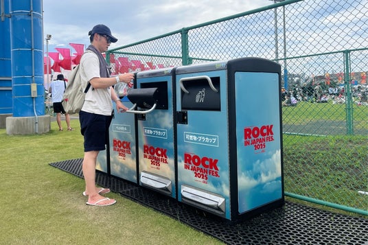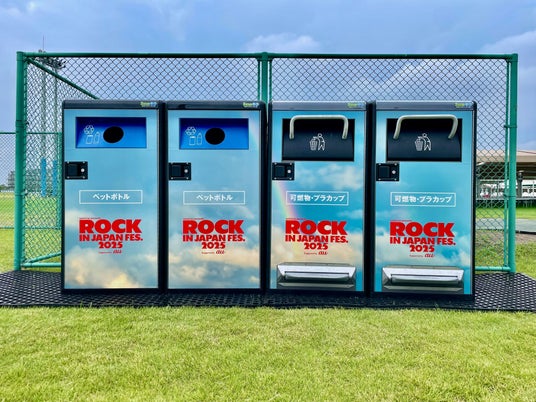 「ROCK IN JAPAN FES. 2025」のメインビジュアルをラッピング。フェスの世界観に溶け込みつつも、来場者の目を引くデザインで正しい分別を促します。