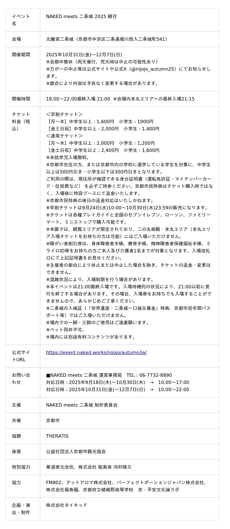 株式会社ネイキッド(英語表記:NAKED, INC.、所在地:東京都渋谷区、代表:村松亮太郎)は、世界遺産・二条城(京都市中京区)にて「NAKED meets 二条城 2025 ―観月―」を開催いたします。江戸時代、二条城の人々が愛でた月。その風雅を、光と伝統文化の融合によって現代に蘇らせる、秋ならではの夜間限定アート展です。