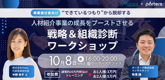 人材ビジネス向けマッチングシステムを提供するポーターズ株式会社(東京証券取引所グロース. 証券コード5126、東京都港区、代表 西森 康二)は、株式会社Matkaと共同で40人限定のプレミアムワークショップ「“できているつもり”から脱却する 人材紹介事業の成長をブーストさせる戦略&組織診断ワークショップ」を2025年10月8日(水)16:00~ポーターズの東京本社にて実施いたします。