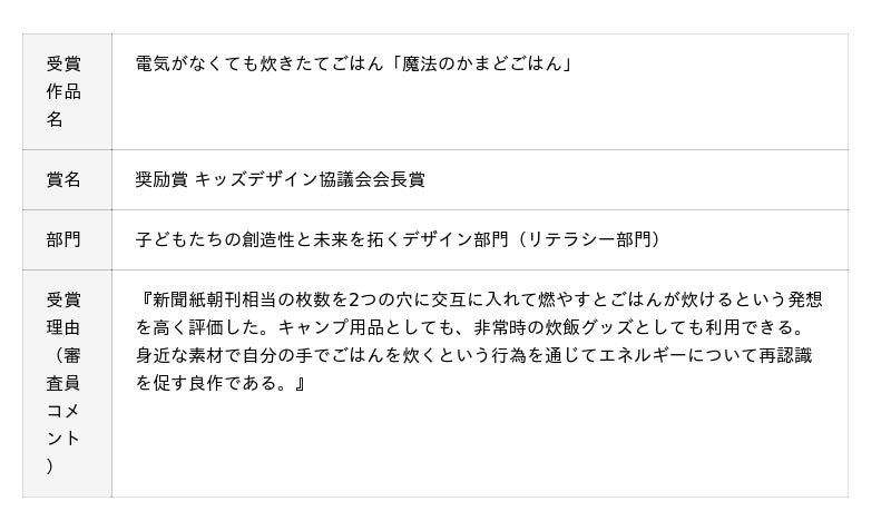 今回の受賞では、「新聞紙を燃やしてごはんが炊けるという発想」「身近な素材で自分の手でごはんを炊くという行為を通じてエネルギーについて再認識を促す」という点を高く評価いただきました。