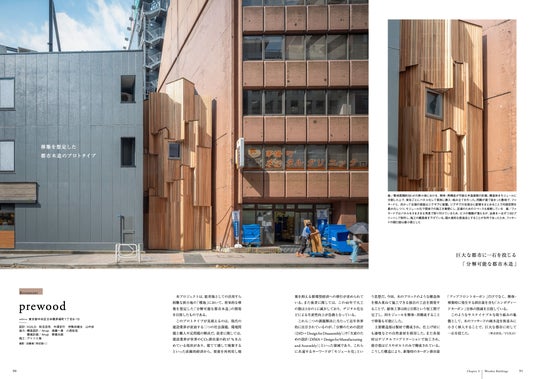 狭小地において、将来的な移築を前提とした分解可能な都市木造、「prewood」についても誌面でご紹介しています。建設業界が抱えるCO2排出や職人不足といった社会課題に対して「分解のための設計(DfD)」や「モジュール化」を取り入れ、循環型の街づくりを目指しました。 木造ファサードが象徴するサステイナブルな思想と、その実現に向けた設計プロセスの詳細についてぜひ誌面でご覧ください。