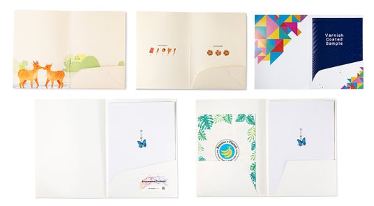 1.10種の型を保有 2.FSC(R)認証紙やバナナペーパー、インバーコートなど、CO2排出量削減の用紙もご相談可能 3.疑似エンボス加工をはじめとする様々な加工をご用意