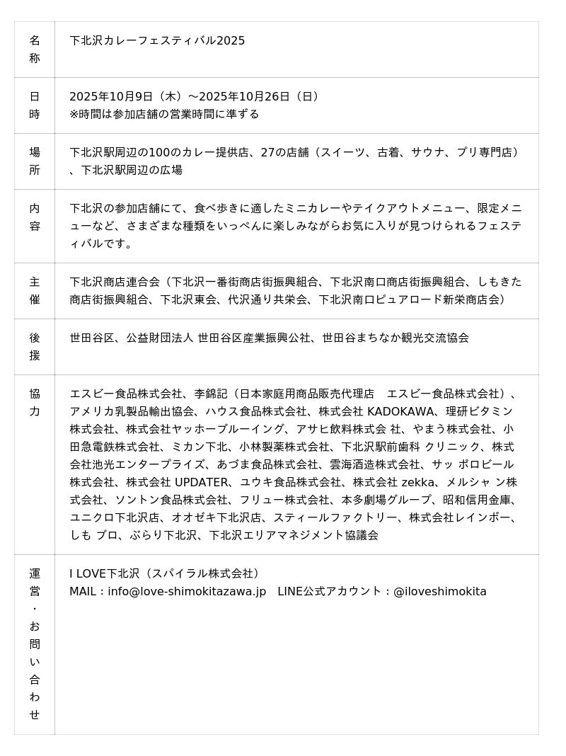 デジタルで未来最適をリードするスパイラル株式会社(東京都港区、 代表取締役グループCEO 佐谷 宣昭)のまちおこしDXカンパニーと下北沢商店連合会(会長 長沼 洋一郎)は、2025年10月9日(木)から10月26日(日)までの18日間、下北沢のオリジナルカレーが楽しめる「下北沢カレーフェスティバル2025(以下「下北沢カレーフェス」)」を開催いたします。