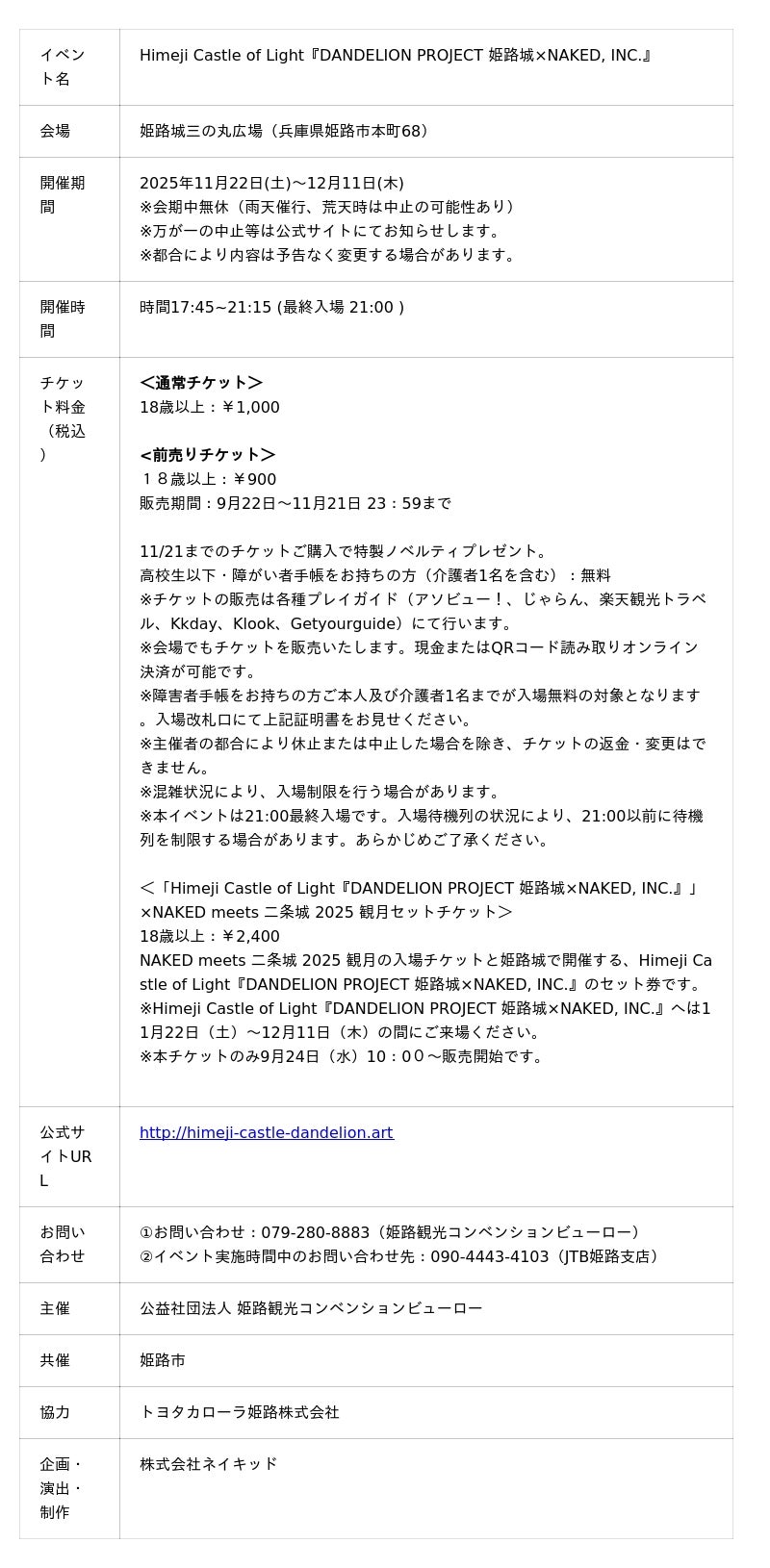 株式会社ネイキッド(英語表記:NAKED, INC.、所在地:東京都渋谷区、代表:村松亮太郎)は、2025年11月22日(土)から12月11日(木)まで、世界遺産・姫路城(兵庫県姫路市)にて開催するイマーシブアートイベント「Himeji Castle of Light 『DANDELION PROJECT 姫路城 × NAKED, INC.』」の第二弾情報として、全コンテンツ詳細を解禁します。来場者の息吹で光が広がる体験型アートや、子どもたちと共に描いた“平和の花”など、祈りを灯すインスタレーションが夜ごとに城を包み込み、歴史的景観とデジタルアートが響き合う幻想的な時間を創出します。