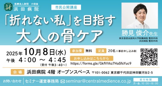 株式会社セントラルメディエンス(本社:東京都港区、代表取締役:中川隆太郎、以下「当社」)の提携先医療機関である、医療法人財団 小畑会 浜田病院(所在地:東京都千代田区、院長:合阪幸三、以下「当院」)は、10月8日(水)に骨粗しょう症に関するセミナーを開催いたします。