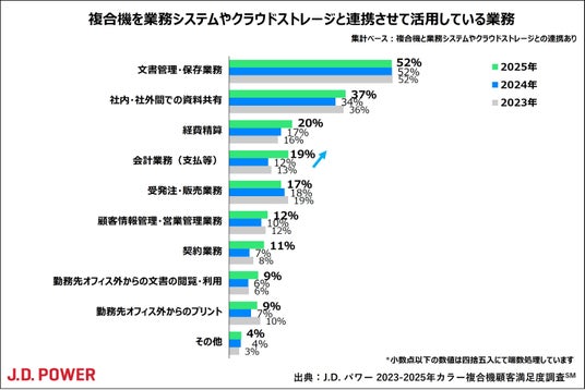 複合機を外部クラウドや業務システムと連携させて活用している企業は依然として少ないものの、これらの企業における実際の活用業務内容には前年からの変化が見られた。本年も「文書管理・保存業務」が52%と最も多く挙がっているが、「会計業務(支払等)」での活用が前年の12%から19%と、顕著な増加が見られた。加えて「経費精算」や「契約業務」も緩やかに増加している。近年の電子帳簿保存法の改正等を背景に、紙の請求書や契約書類等を電子化し、システムへ直接連携する活用が広がっていることがうかがえる。