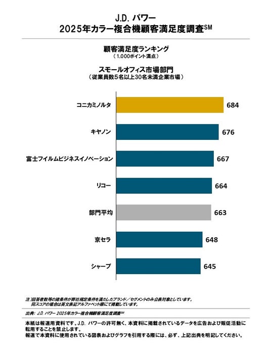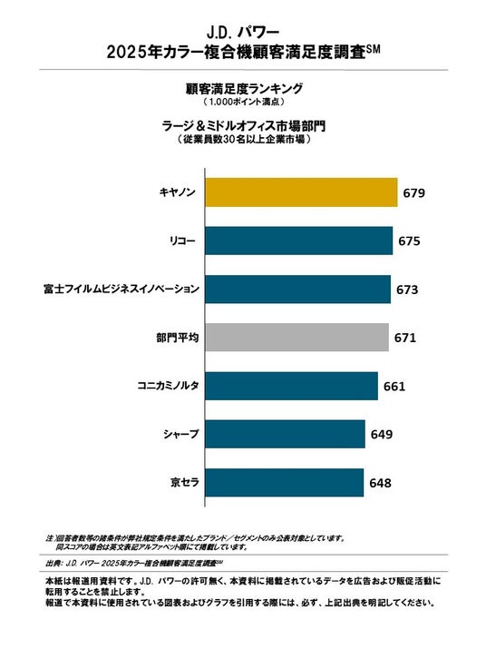 2025年の総合満足度スコア(1,000ポイント満点)は、カラー複合機のラージ&ミドルオフィス市場で671ポイント、スモールオフィス市場で663ポイント、カラーレーザープリンターでは639ポイントとなった。