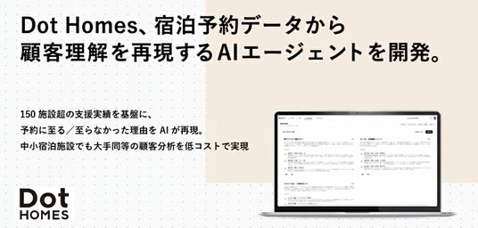 西武グループにおいて宿泊施設の集客支援を行う、株式会社Dot Homes(所在地:東京都豊島区南池袋1丁目16−15 ダイヤゲート池袋、代表取締役:留田紫雲)は、累計150施設以上の支援実績と蓄積した予約データを強みに、宿泊施設の予約情報をもとにAIがペルソナを生成し、予約に至る/至らなかった理由を再現できるAIエージェントを開発しました。