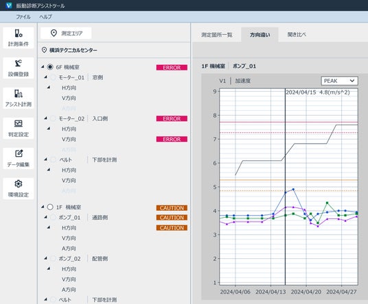 本製品の計測・データ管理を支援するPC用アプリケーション機能です。あらかじめ計測条件や設備情報を登録し、本体に送信することで、現場で機械ごとに条件を設定する手間を省き、効率的な点検が可能になります。また、本体で取得したデータをPCに取り込み、傾向管理グラフの表示や振動音の再生が行えます。これにより、数台の機械から設備診断に取り組み、定期的な傾向管理を通じて、的確なメンテナンス判断を行う体制の構築を支援します。