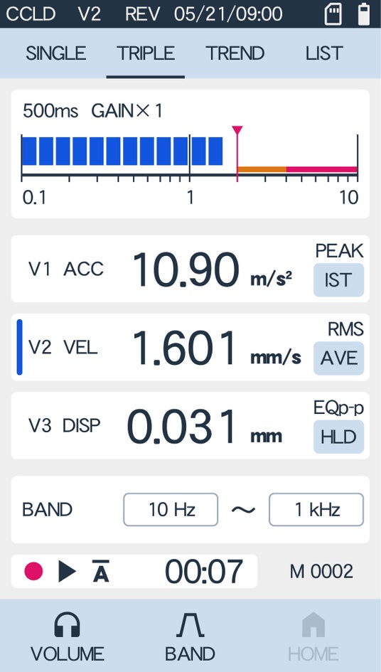・V3バンドで3つの振動値を同時に計測・表示(当社独自機能)/異常を的確に把握でき作業効率UP・可変バンドパスフィルターを利用した聴音機能で異音を捉え、作業者との共有や技術伝承に活用