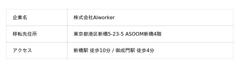 AIworkerは、2025年8月12日に東京都港区新橋のASOOM新橋への移転を行いました。新オフィスにて、お客様へのサービス提供を継続いたします。
