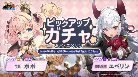 このたびの無料ゲームランキング1位獲得を記念して、新ヒーロー「SSR 市長 ポポ」「SSR 市長候補エベリン」をピックアップしたガチャを開催いたします!