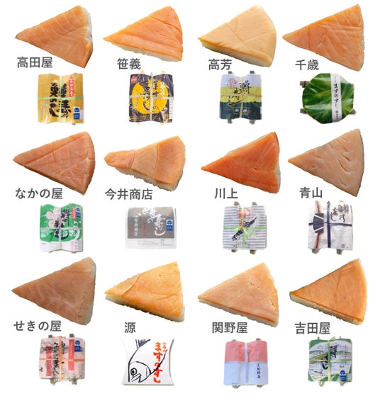 千歳、青山総本舗、吉田屋鱒寿し本舗、川上鱒寿し店、今井商店、元祖関野屋、高田屋、