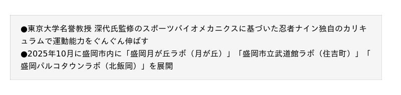 総合教育サービス企業の株式会社やる気スイッチグループ(東京・中央区、代表取締役社長:高橋 直司 以下、やる気スイッチグループ)は、やる気スイッチグループが展開する幼児・小学生向けスポーツ教室「忍者ナイン(R)」を岩手県盛岡市内に3教室(ラボ)一斉開校します。2025年10月15日(水)に「盛岡月が丘ラボ」、10月16日(木)に「盛岡市立武道館ラボ」、10月25日(土)に「盛岡パルコタウンラボ」が開校予定です。