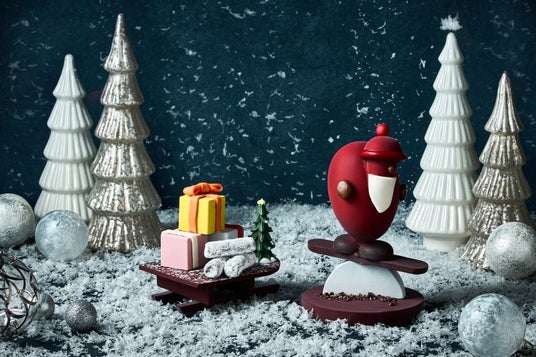雪をスノーボードで滑るサンタクロースと、カラフルなギフトを積んだそりをかたどったクリスマス限定チョコレート。フランス・ヴァローナ社の深みあるチョコレートを使用し、スノーボードサンタの中には和三盆で味付けした香ばしいピーカンナッツを忍ばせました。そりには薪に見立てたフランスの伝統的なチョコレート菓子「ミュスカディーヌ コワントロー」やチョコレートで作ったギフトボックスを載せ、飾っても味わっても楽しめる、贈り物として格別の一品です。