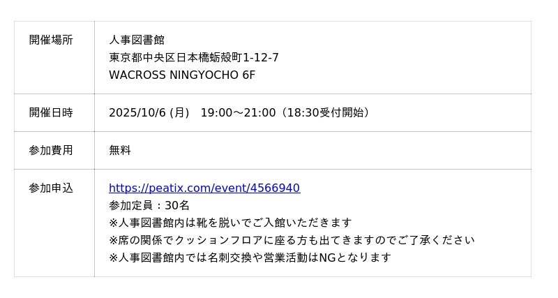 株式会社Trustyyle(本社:東京都中央区・代表取締役:吉田洋介)は、運営するコミュニティ「人事図書館」にて、2025年10月6日(月)に「人事のレンタル移籍体験共有!ベンチャー⇔大手企業の越境で人事はもっと面白くなる」を開催します。
