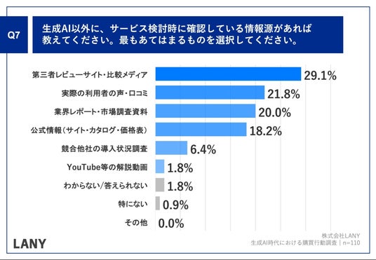 「Q.生成AI以外に、サービス検討時に確認している情報源があれば教えてください。最もあてはまるものを選択してください。」(n=110)と質問したところ、「第三者レビューサイト・比較メディア」が29.1%、「公式情報(サイト・カタログ・価格表)」が18.2%という回答となりました。