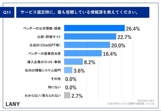 「Q.サービス選定時に、最も信頼している情報源を教えてください。」(n=110)と質問したところ、「ベンダーの公式情報・提案」が26.4%、「生成AI(ChatGPT等)」が20.0%という回答となりました。