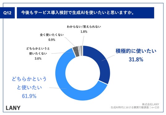 「Q.今後もサービス導入検討で生成AIを使いたいと思いますか。」(n=110)と質問したところ、「積極的に使いたい」が31.8%、「どちらかというと使いたい」が61.9%という回答となりました。
