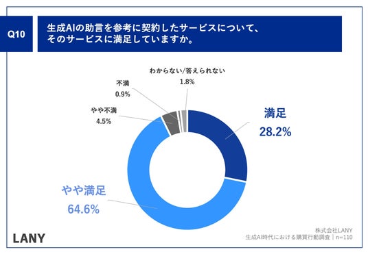 「Q.生成AIの助言を参考に契約したサービスについて、そのサービスに満足していますか。」(n=110)と質問したところ、「満足」が28.2%、「やや満足」が64.6%という回答となりました。