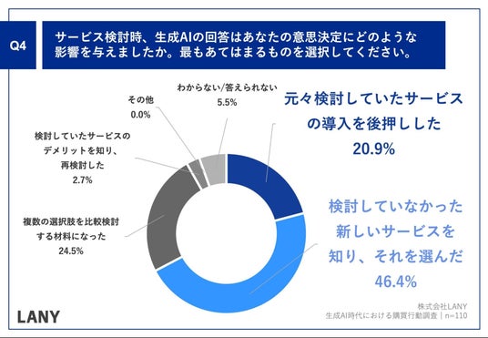 「Q.サービス検討時、生成AIの回答はあなたの意思決定にどのような影響を与えましたか。最もあてはまるものを選択してください。」(n=110)と質問したところ、「元々検討していたサービスの導入を後押しした」が20.9%、「検討していなかった新しいサービスを知り、それを選んだ」が46.4%という回答となりました。