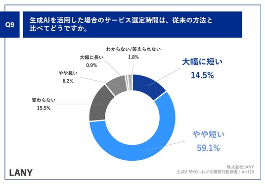 「Q.生成AIを活用した場合のサービス選定時間は、従来の方法と比べてどうですか。」(n=110)と質問したところ、「大幅に短い」が14.5%、「やや短い」が59.1%という回答となりました。