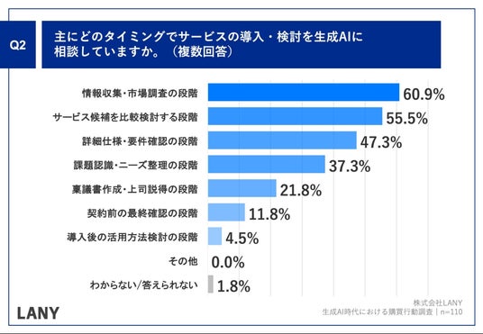 デジタルマーケティング支援事業を展開する株式会社LANY(本社:東京都渋谷区、代表取締役:竹内渓太)は、サービス・ツールの導入・検討の意思決定に携わっており、過去1年以内に生成AIに相談してサービス・製品を契約・購入した経験があるBtoB企業の方110名を対象に、生成AI時代における購買行動調査を実施しましたので、お知らせいたします。