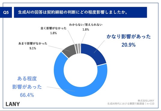 「Q.生成AIの回答は契約締結の判断にどの程度影響しましたか。」(n=110)と質問したところ、「かなり影響があった」が20.9%、「ある程度影響があった」が66.4%という回答となりました。