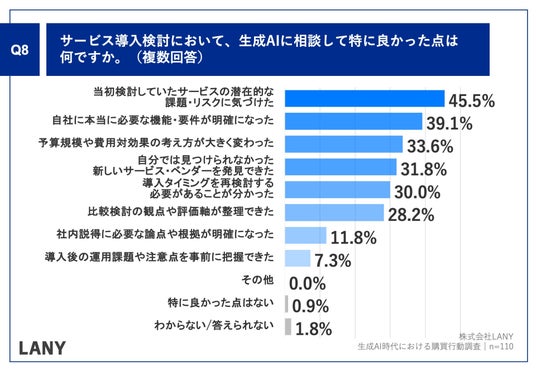 「Q.サービス導入検討において、生成AIに相談して特に良かった点は何ですか。(複数回答)」(n=110)と質問したところ、「当初検討していたサービスの潜在的な課題・リスクに気づけた」が45.5%、「自社に本当に必要な機能・要件が明確になった」が39.1%、「予算規模や費用対効果の考え方が大きく変わった」が33.6%という回答となりました。