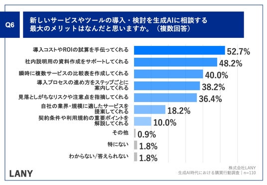 「Q.新しいサービスやツールの導入・検討を生成AIに相談する最大のメリットはなんだと思いますか。(複数回答)」(n=110)と質問したところ、「導入コストやROIの試算を手伝ってくれる」が52.7%、「社内説明用の資料作成をサポートしてくれる」が48.2%、「瞬時に複数サービスの比較表を作成してくれる」が40.0%という回答となりました。