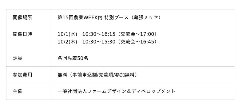 食と農業専門の経営コンサルティング会社であるアグリコネクト株式会社(本社:東京都港区芝公園一丁目3番8号 苔香園ビル4階、代表取締役社長:熊本 伊織)は、一般社団法人ファームデザイン&ディベロップメントから委託を受け、幕張メッセで行われる国内最大級の農業展示会『第15回 農業WEEK(通称:J-AGRI)』にて、「ファームデザイン&ディベロップメントフォーラム2025」を2025年10月1日(水)・2日(木)に開催します。