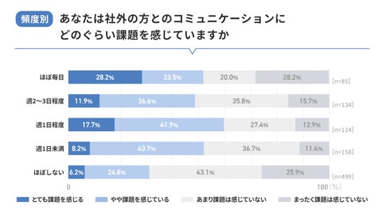 また取引先などチーム外とのやりとりにおいても課題感が顕著です。週1日程度リモート勤務をする人のうち、「とても課題を感じる(17.7%)」「やや課題を感じている(41.9%)」と回答した割合は計59.6%に上り、全体平均の42.0%を上回りました。意思疎通や関係構築に支障をきたしている実態が明らかになりました。