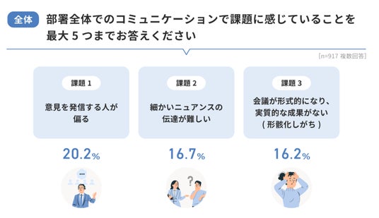 これらを解決するには、コミュニケーションの可視化や、上司・部下が安心して意見交換できる場の整備、さらに社外の関係者とも円滑に連携できる仕組みづくりなど、これまで以上の工夫が欠かせません。活発な議論と一体感の回復こそが、今後の組織に求められる要素だといえます。