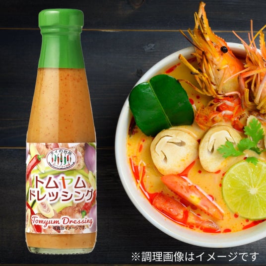 当社では、このトムヤムの風味をもっと身近に、日常の食卓でも楽しめるよう、"ドレッシング"という形で商品化しました。酸味・辛味・ハーブの香りが絶妙に調和した本商品は、グリーンサラダやコールスローはもちろん、生春巻きや揚げ物のソース、鍋のつけダレとしても活用できる万能調味料です。毎日の食事に彩りと刺激を添える"新しい定番ドレッシング"として、お楽しみください。」