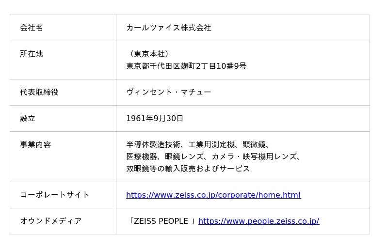 ZEISSは、1846年にドイツで創業した光学技術を用いた事業を多角的に展開する国際的なリーディングカンパニーです。日本には1911年に設立したカールツァイス株式会社、カールツァイスメディテック株式会社、カールツァイスビジョンジャパン株式会社の3つの法人があります。4つのセグメント(半導体製造技術、産業品質・研究、医療技術、消費者市場)で事業を展開し、売上高100億ユーロを超えるグローバル企業です。工業計測、品質保証、ライフサイエンス、材料研究、眼科、マイクロサージェリーなど、様々な分野で革新的なソリューションを提供しており、世界中で高い評価を得ています。2024年現在、売上高の15%を研究開発に投資しており、約46,000人の従業員、35の生産拠点、60以上の販売・サービス拠点、約40の研究開発施設を擁し、約50カ国で事業を展開しています。また、オーナーであるカールツァイス財団は、科学の振興を目的とするドイツ最大級の財団です。