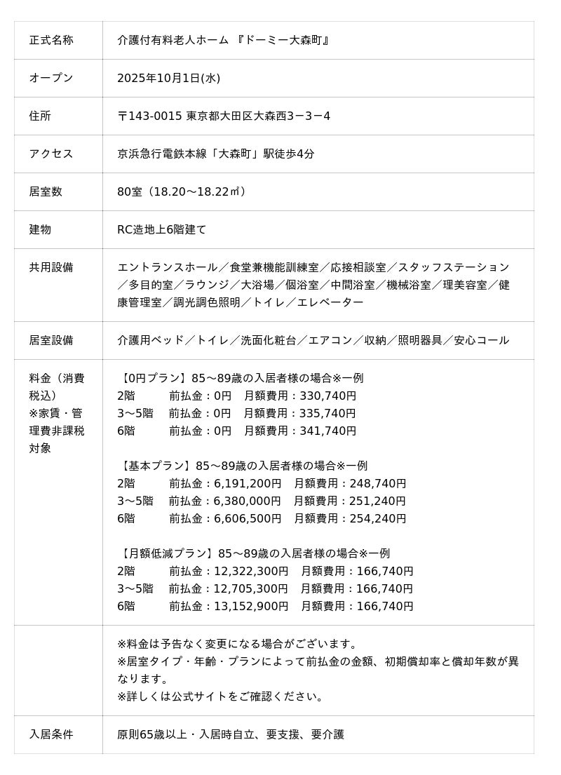 【ドーミーイン・共立リゾートを手掛ける共立メンテナンスのシニア向け住宅】介護付有料老人ホーム 『ドーミー大森町』 2025年10月1日(水)オープン