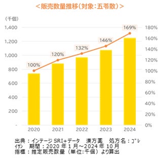 2024年の漢方薬市場において、注目すべきトレンドの一つに『五苓散』があげられます。『五苓散』は全身の水分バランスの乱れを整え、余分な水分を排出することで頭痛やむくみを改善する漢方薬です。直近5年間で、五苓散の販売数は69%増と急速に成長しています。この背景には、医療用と一般用の双方における処方名の認知拡大が要因として考えられます。医療用市場では、コロナの5類移行に伴う「受診控え」の解消によって受診者総数の増加を背景に、頭痛や急性胃腸炎で受診する患者数の増加とそれに伴う五苓散の処方増加がみられました。