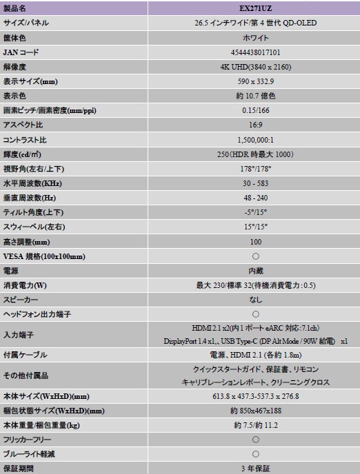 「EX271UZ」製品仕様表