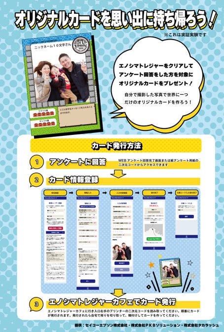 体験型コンテンツ「リアル宝探し」の企画・制作・運営を手がける株式会社タカラッシュ(本社:東京都品川区、代表取締役:齊藤 多可志、以下タカラッシュ)は、2月7日(火)より藤沢市・藤沢市観光協会主催により江の島・片瀬エリアで行うリアル宝探しイベント「エノシマトレジャー ~小さな勇者と世界の目覚め~」を開催します。また新しい試みとして、セイコーエプソン株式会社(本社:長野県諏訪市)、株式会社PKBソリューション(本社:滋賀県野洲市)と連携し、クリア者の中からアンケートに答えた方を対象に世界で一つだけのカードが作成できる、オリジナルカード発行サービスの実証実験を開始いたしました。