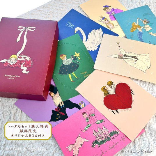 リボンの女の子と真っ赤な背景のアートに、さりげなくきらめく箔押し加工を。心奪われる専用ボックスとプレミアムポストカード全種入りのEC限定豪華コンプリートセットも合わせて登場します。