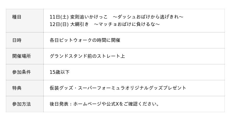 今大会のイベントタイトル「スーパーフォーミュラハロウィン」に合わせた特別な運動会を開催いたします。