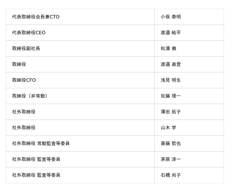 代表者 :代表取締役会長兼CTO 小俣泰明、代表取締役CEO 渡邉純平