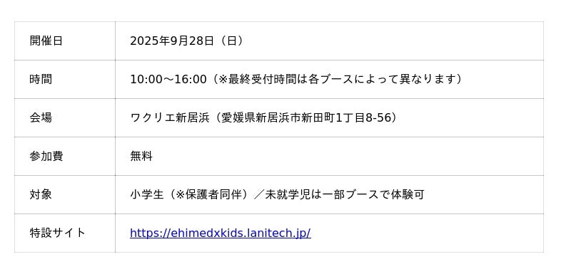 「あなたと社会のテクノロジーパートナー」を掲げるlanitech合同会社(本社:東京都渋谷区、代表取締役CEO兼CTO:西脇 靖紘、以下「lanitech」)は、愛媛県が推進する「地域DX実践支援業務」の一環として、子どもたちが未来のデジタル技術を遊びながら学べる体験型イベント 「えひめDXキッズフェスタ2025 in 新居浜」を2025年9月28日(日)に開催いたします。