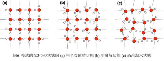本研究成果から、ナノ結晶細孔に閉じ込められた水の状態を模式図にまとめます(図6)。完全に凍結したWMCの状態では、D2Oは氷のような水素結合を形成し、回転振動モードで揺動しています(図6(a))。前融解状態では、ほぼ固定化されたD2OのO原子を中心としてD2Oが激しく回転運動する揺らぎが起こっています(図6(b))。過冷却水状態では、D2OがO原子とともに自由に揺らぐ回転運動を起こしているものと判断できます(図6(c))。