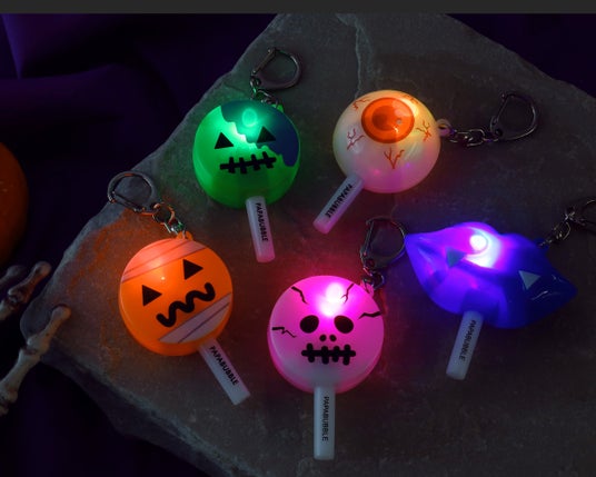 「光るロリポップ」をモチーフにした全5種のチャームは、スイッチを入れると本物さながらに光ります。昨年よりホラー感を増したデザインで、コレクションとしても楽しめます。