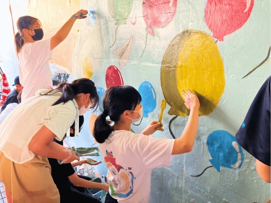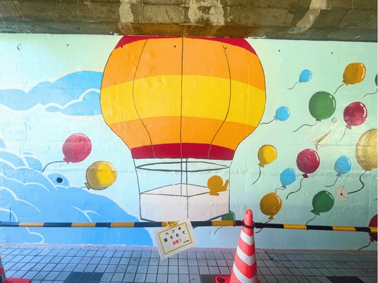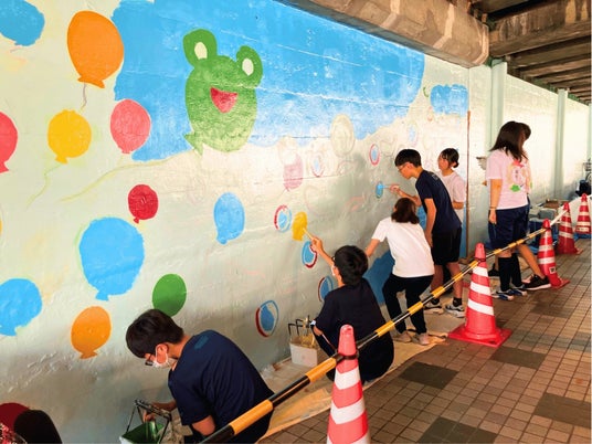 壁画制作では中野区立緑野中学校の生徒が空をイメージしたデザインを考案し、同区立の緑野小学校・北原小学校の児童とともに総勢約20人で壁画を描きました。落書きがなくなるようにとの想いを込めて、縦約2.5メートル、横約10メートルの壁に、気球・風船・シャボン玉・カエルなどを描きました。